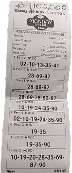 An EasyWin player from Shagamu, Ogun State, placed ₦38,550 on Ghana Lotto Monday Special — hitting 1 Direct 3 and 3 Perm 2 bets to win ₦9,102,000 in total! Don’t wait for luck to find you — play Ghana Lotto and more instantly on EasyWin.